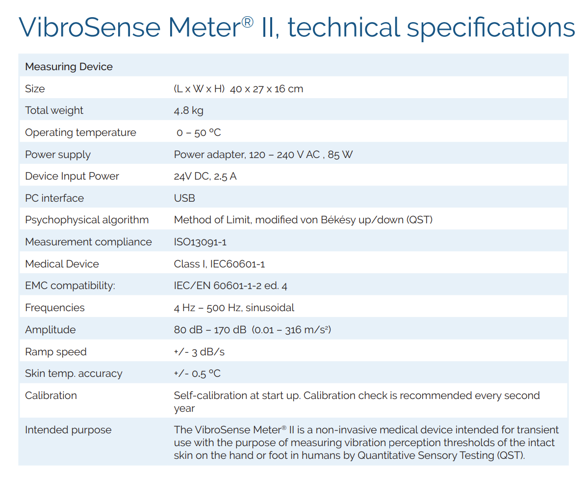 • 使用目的:VibroSense Meter® II 為非侵入式醫療裝置,適用於短時間使用,透過定量感覺測試(QST)測量人體手部或足部完整皮膚的振動感覺閾值