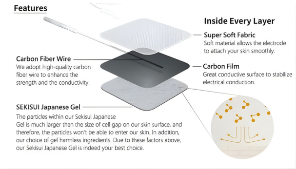 Everyway 黏貼式電極片是適用於所有使用 2mm 豬尾式插針接頭之 TENS、EMS 及 IFT 治療儀的高級選擇。產品採用高品質且具生物相容性的日本 SEKISUI 凝膠,可有效且均勻地將電刺激儀的電流傳導至患者皮膚,提升治療舒適度與導電效率。